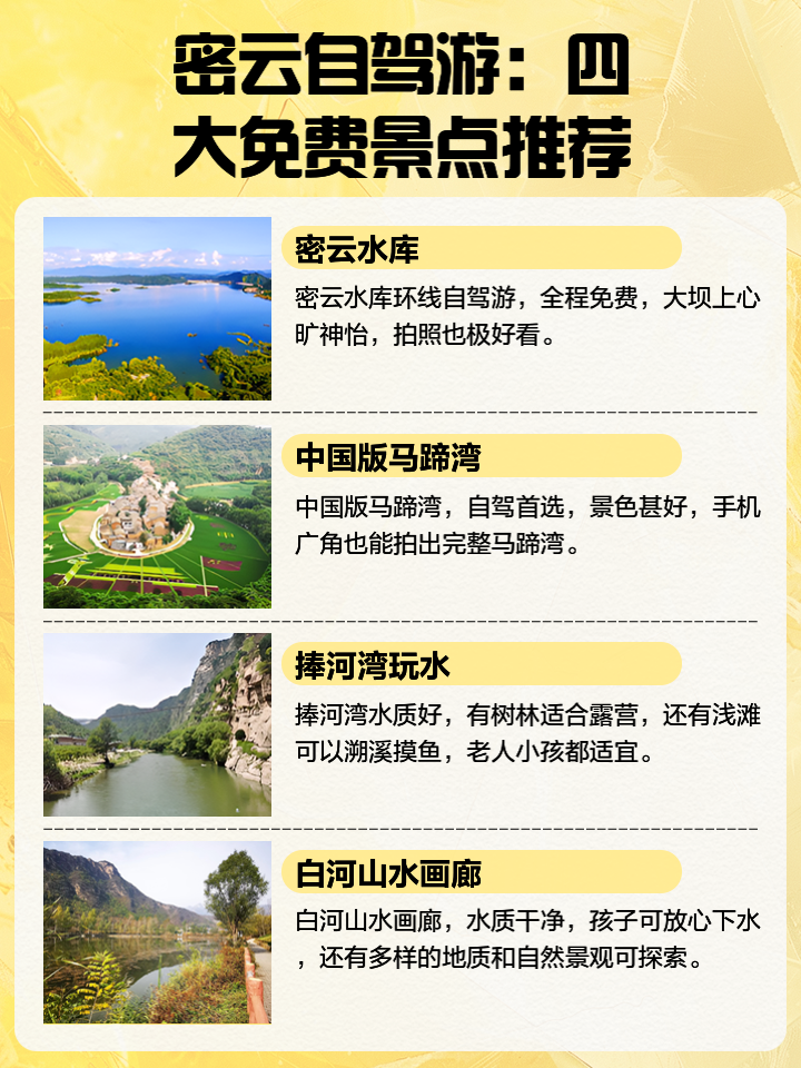 就是我們?yōu)槟榻B的密云自駕游免費(fèi)景點(diǎn),這些景點(diǎn)既有自然風(fēng)光,也有人文景觀,適合家庭出游和朋友聚會(huì),在享受自駕游的同時(shí),也能感受到密云區(qū)的美麗和魅力,希望您在密云自駕游的過(guò)程中,能夠找到屬于自己的樂(lè)趣和體驗(yàn),也請(qǐng)您在旅行過(guò)程中注意保護(hù)環(huán)境,做一個(gè)文明的旅行者,祝您在密云的旅行愉快!