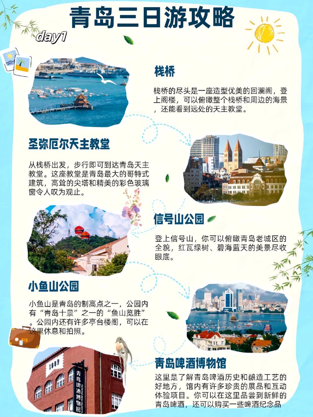 2、旅行路線:在游玩青島時(shí),建議先從海濱風(fēng)景區(qū)開始,然后前往歷史文化區(qū),最后到自然探索區(qū),不妨品嘗當(dāng)?shù)孛朗澈腕w驗(yàn)漁家文化。